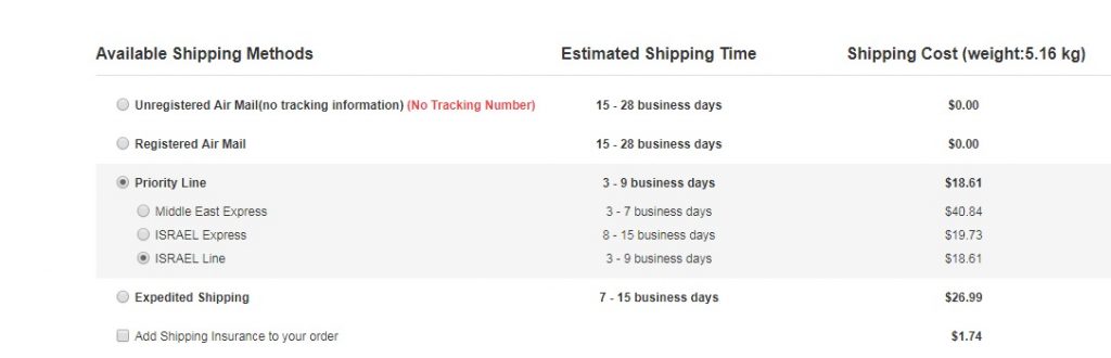 מחברות השילוח היעילות בישראל, שימו לב שתחת Priority Line כרגע נפתחה אופצייה חדשה שנקראת ISRAEL Line זמן השילוח הכולל הוא בין 3-9 ימים מהרגע שהמוצר נשלח וכ-1-3 ימים מהרגע שהמוצר מגיע לארץ.