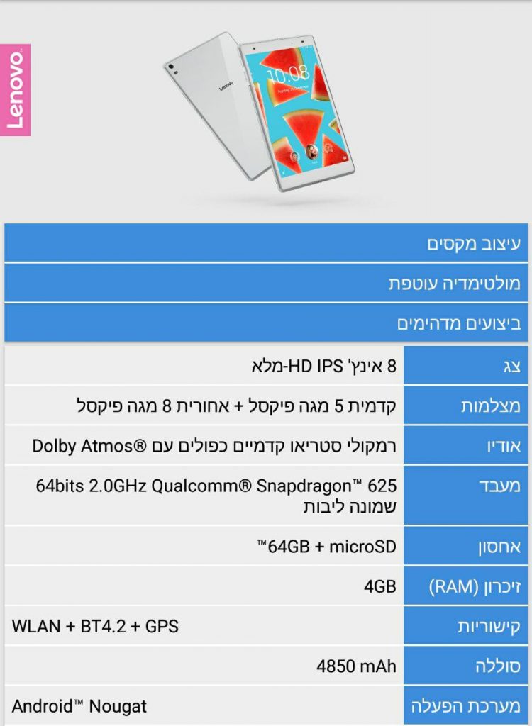 לדגם שנסקר Lenovo TAB4 8 Plus :